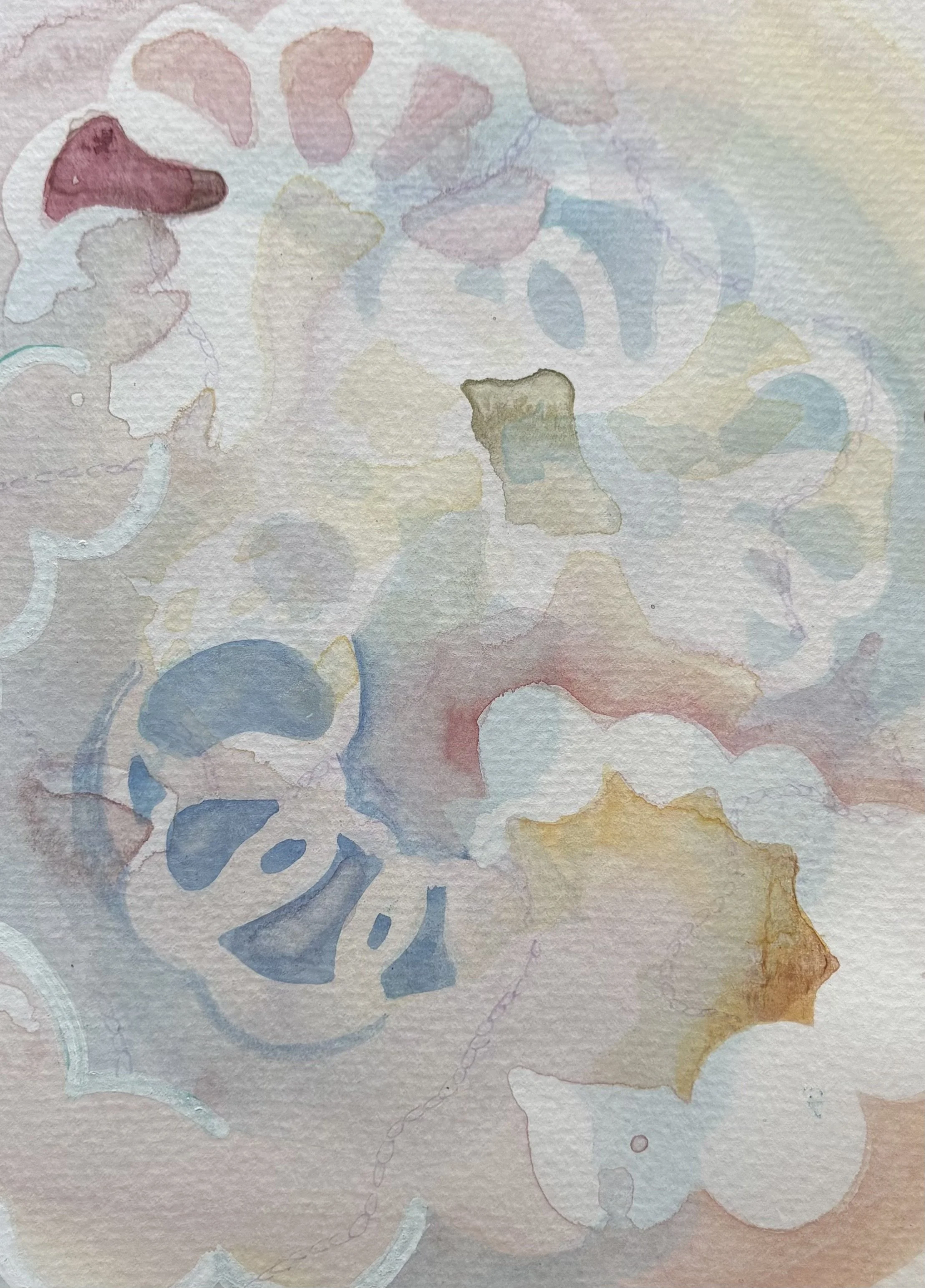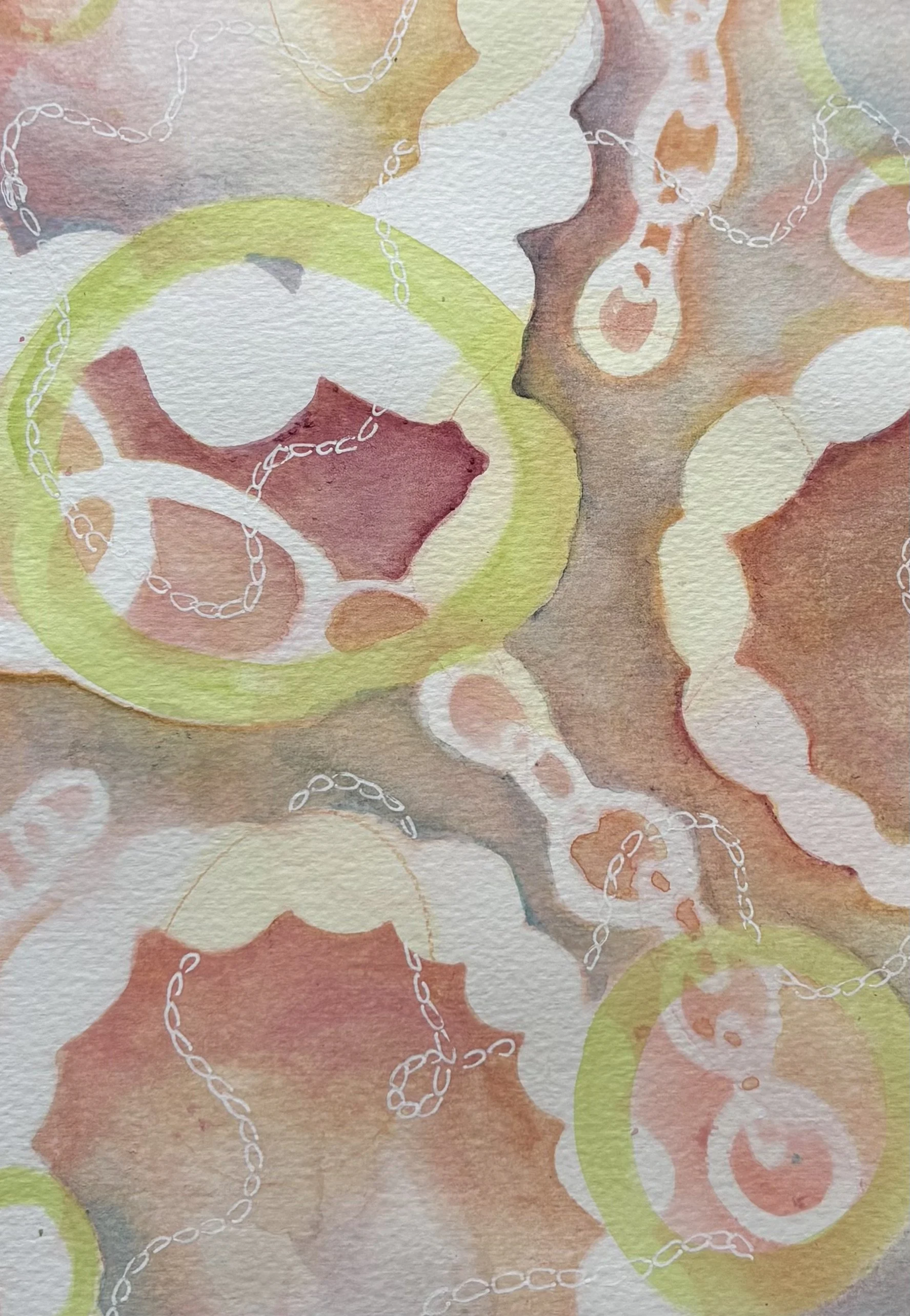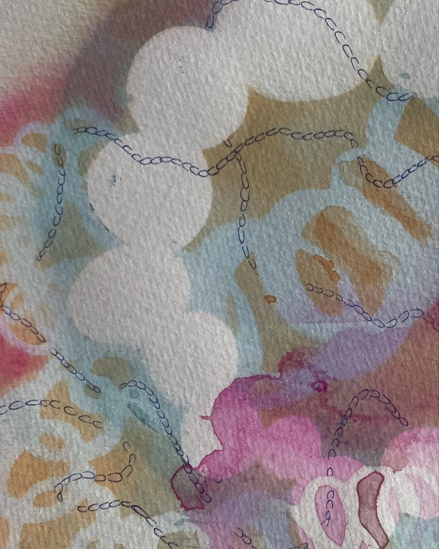 Niamh transforms therapeutic creative techniques—like embroidery, chain‑making, and beading—into abstract expressions of emotional exploration. She draws on familiar forms—loops, stitches, chains—and exaggerates them into visual metaphors for her evolving inner self. Using handmade stencils, she paints in layers with watercolour, enriched with pens, pencils, and mixed media to add depth and nuance.