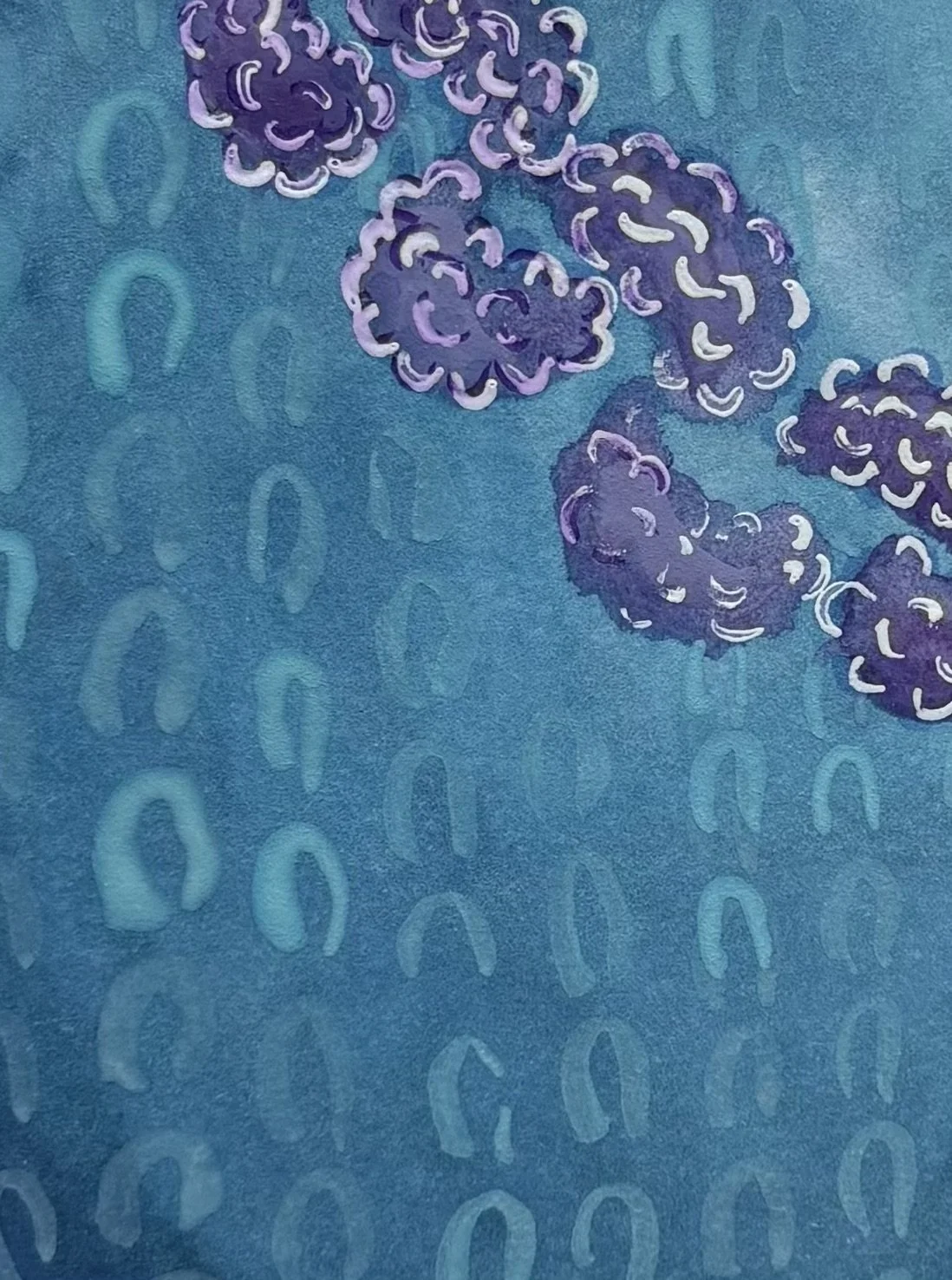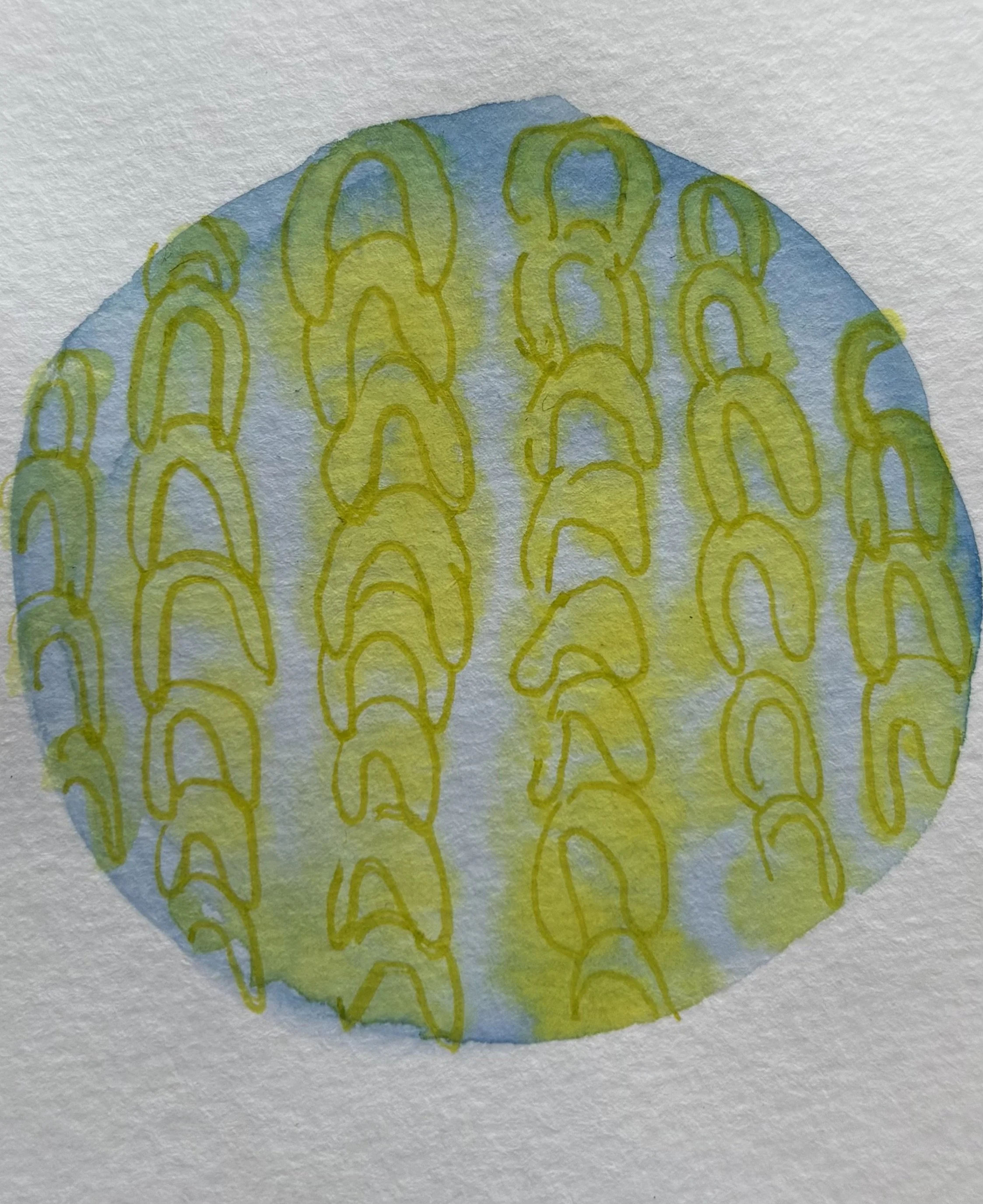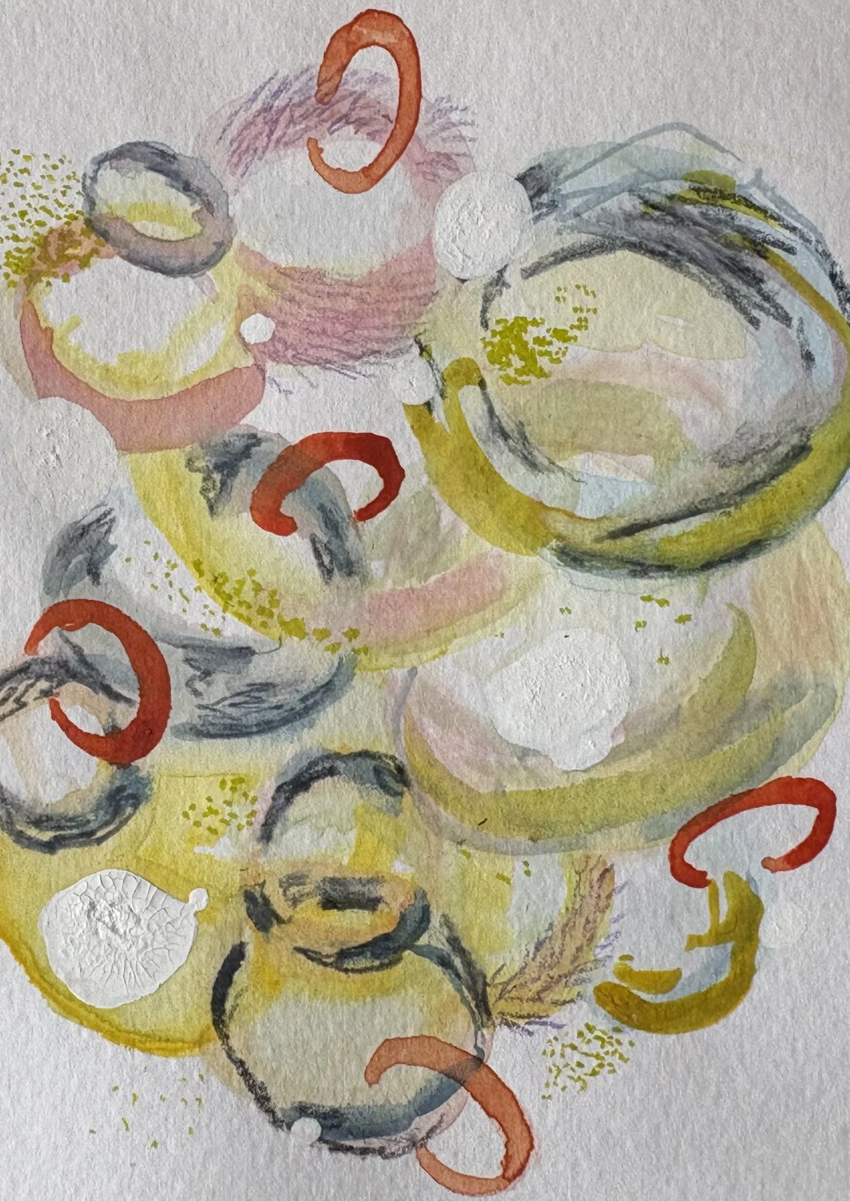 Niamh transforms therapeutic creative techniques—like embroidery, chain‑making, and beading—into abstract expressions of emotional exploration. She draws on familiar forms—loops, stitches, chains—and exaggerates them into visual metaphors for her evolving inner self. Using handmade stencils, she paints in layers with watercolour, enriched with pens, pencils, and mixed media to add depth and nuance.