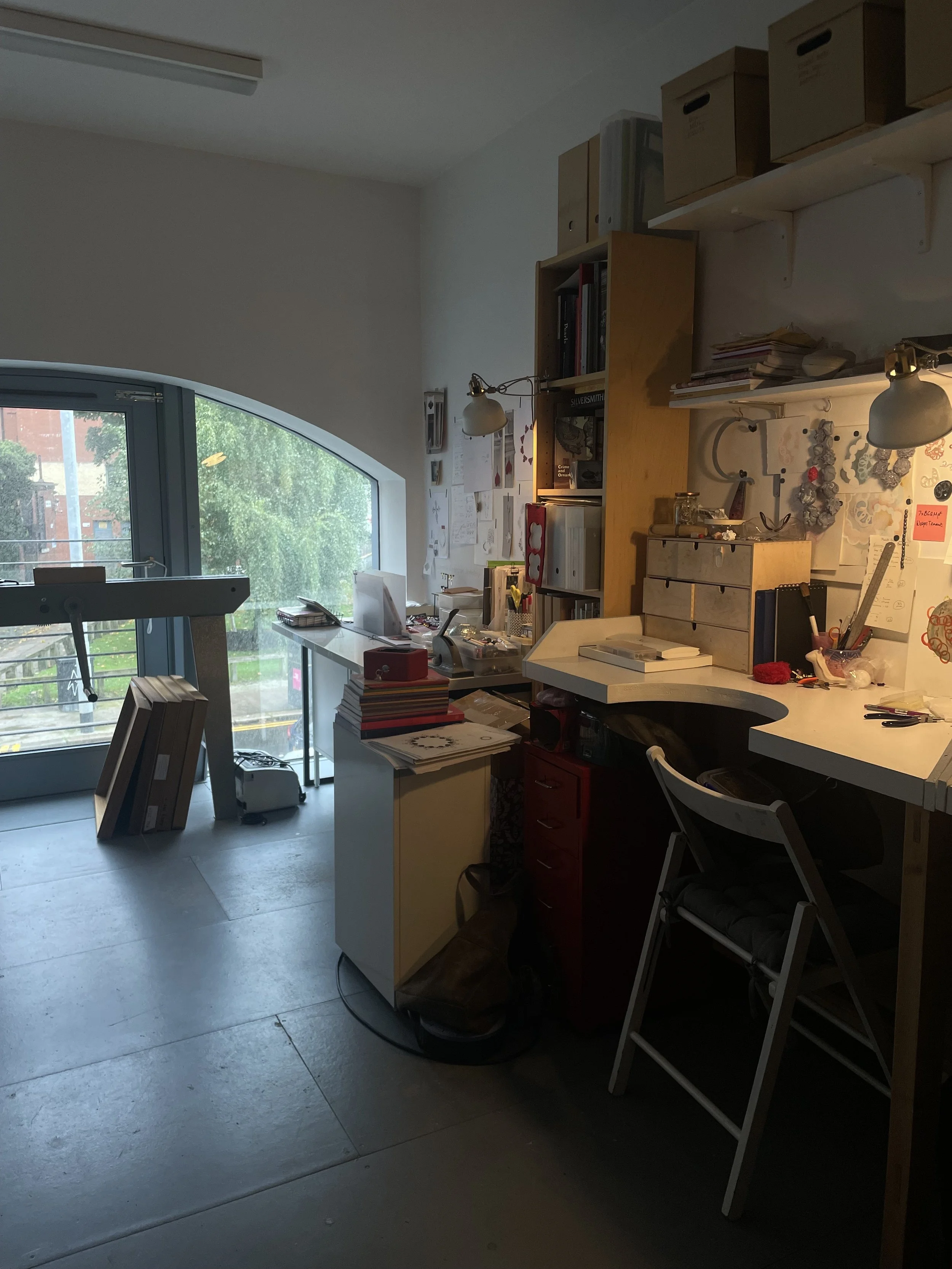 Niamh works from a shared studio at the WASPS Briggait in Glasgow—a lively space full of creative energy. It’s where she sketches, experiments, and brings her jewellery ideas to life, surrounded by a community of fellow makers.